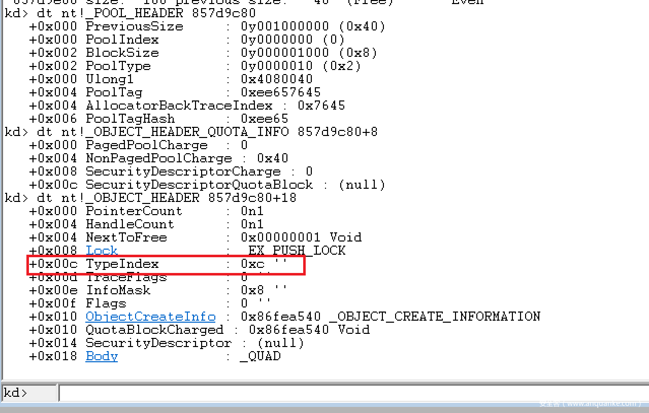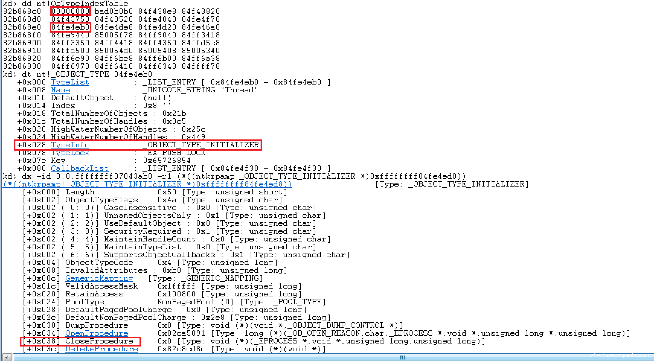 Event结构体中我们关心的字段是TypeIndex这个字段,该字段为一个数组索引,索引的数组为nt!ObTypeIndexTable,该数组是OBJECT_TYPE数组,包含了所有的类型。