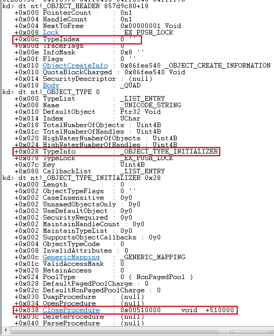 伪造后的相应结构体会变成如下图所示。可以看到TypeIndex被覆盖为0,而0地址处中0x60的值为shellcode的地址,此时在代码中调用CloseHandle即会调用CloseProcedure实现控制流的劫持。相关的代码为: