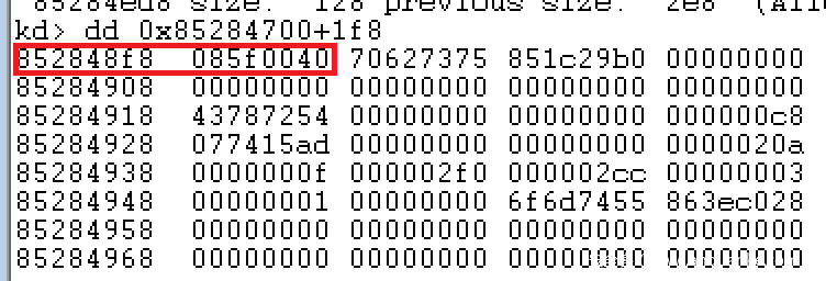 可以看到在当前堆块偏移504的地方既是下一堆块的头结构,此时该地址的内存为