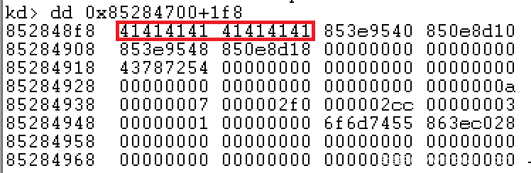 单步执行到下一步,可以看到该地址被覆盖为可控的0x41414141。