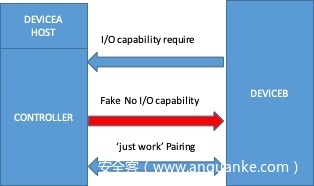 目前的蓝牙协议依然支持‘just work’的配对方式以支持没有输入输出能力的设备.而’just work’方式是没有鉴权的,不支持防中间人攻击和被动监听的。 攻击者可以利用修改过的Link Manager,伪造’just work‘的配对方式需要的条件。