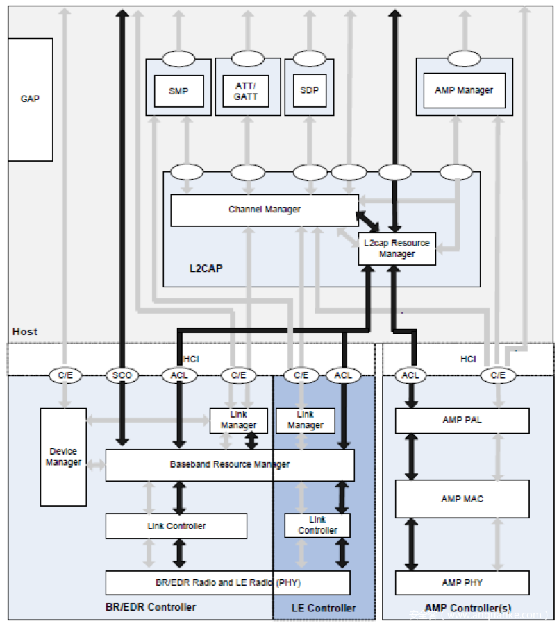 •Controller主要实现物理层的数据传输,跳频和底层数据帧的管理以及连接的建立和拆除和链路的安全和控制。Controller可以运行在SOC芯片里,例如Cypress的CYW20706和CYW20719,也可以运行在单独的Bluetooth controller 芯片或者wifi和bluetooth combo里例如CYW43438 和CYW20710。