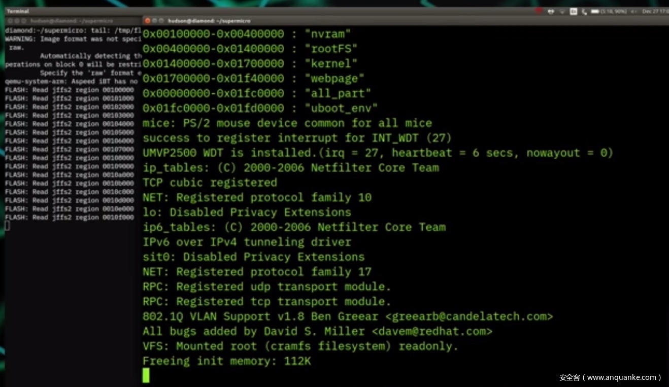 介绍了大致原理后,作者通过qemu搭建模拟环境做了现场演示。如下图所示,左侧是Flash控制台,右侧是BMC的串口控制台。