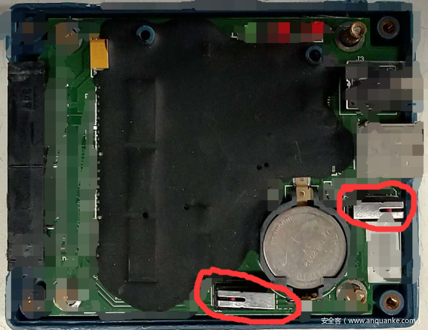 有一些系统对物理攻击采取了一些防范手段,例如下图中的设备, 关键数据例如秘钥等存放在需要供电的RAM中,红色圈内是两个微动开关,用于检测破拆事件, 在破拆后,关键数据自动删除。