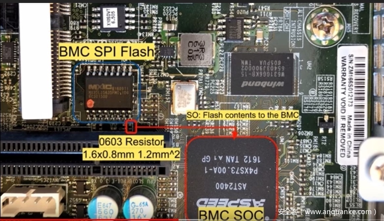 主板上的BMC SPI Flash 通过serial output与BMC CPU连接,这其中经过了一个小的串联电阻,作者就在这个地方插入了他的植入物来完成攻击。