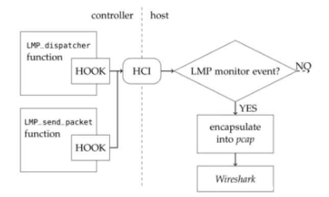 攻击者利用Vendor Specific HCI打入Patch,修改了controller中的Link manager,加入钩子函数,实现了监控和包注入的功能。