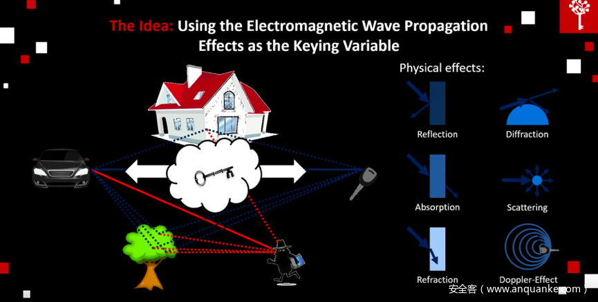 这种方法以电磁波传播效应中的反射、吸收、折射、散射、多普勒效应等参数作为导出key的依据。在自然环境中这些参数不可控,而在一个具有电磁屏蔽的环境中,这些参数的变化就可控了。