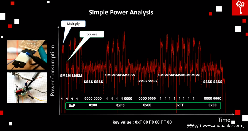 物理安全是一个古老的研究领域,一直以来针对各种安全芯片,例如sim卡,智能卡等的物理攻防一直是业界的研究热点。针对芯片的攻击方法有很多,例如下图的功耗分析,芯片在执行不同的指令时,功耗不同,那分析功耗曲线,也可以还原出目前在执行的指令,进一步获得秘钥。