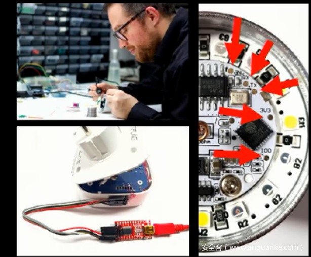 智能灯泡的硬件电路上预留了一些测试接口可以供固件的读取和写入,作者开发了相应的脚本可以读取智能灯泡的固件信息,发现了固件中保存有明文的Wi-Fi密码和SSID,这可能会导致用户家中的Wi-Fi密码的泄露,如果你的灯泡被偷走了的话。